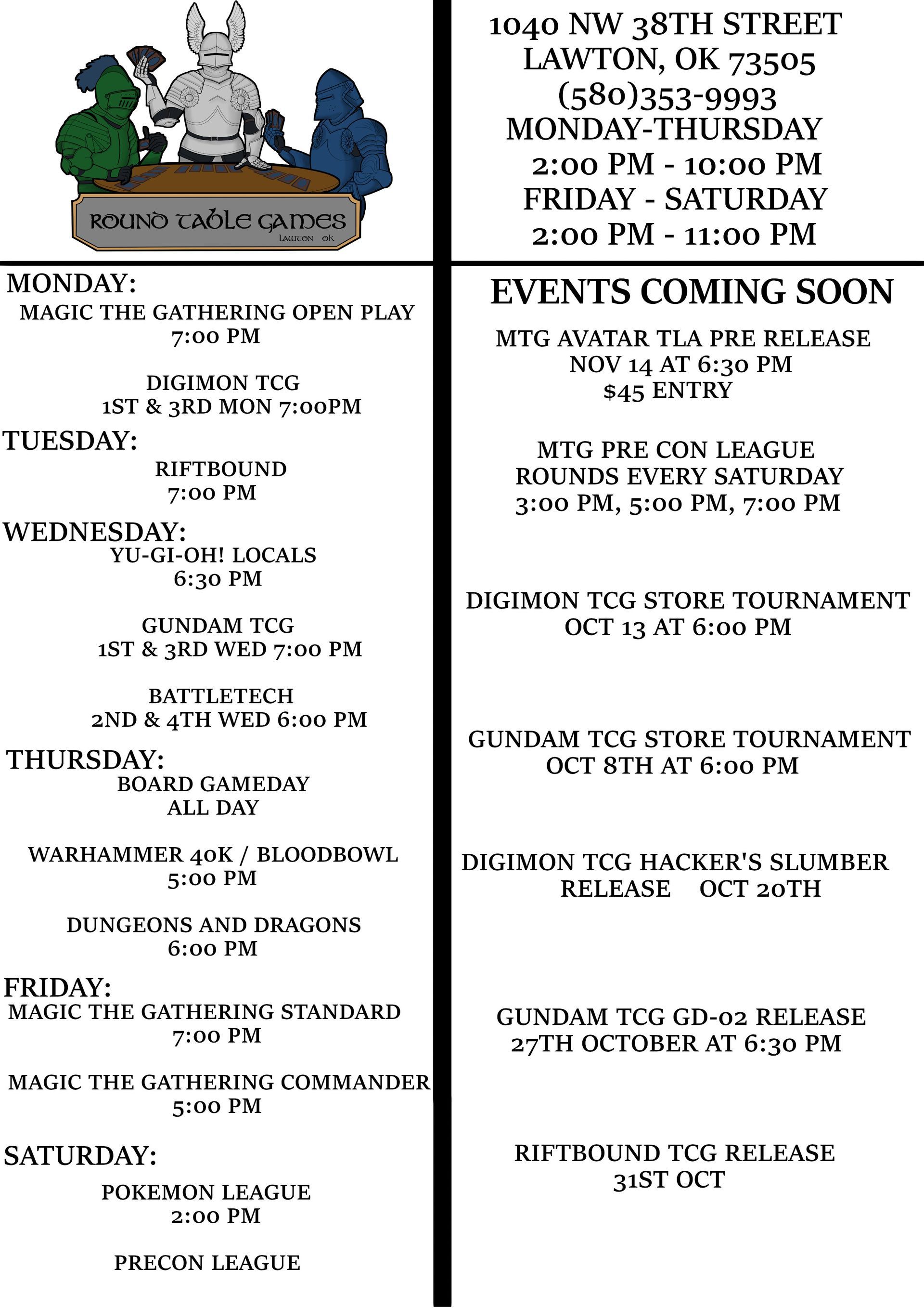 You can find a copy of our flyer below, which lists all of our upcoming events, as well as our normal weekly play schedule. Whether it's normal board games or competitive card games, we have it all! Our staff can also help you find a new game to play and in most cases, teach.